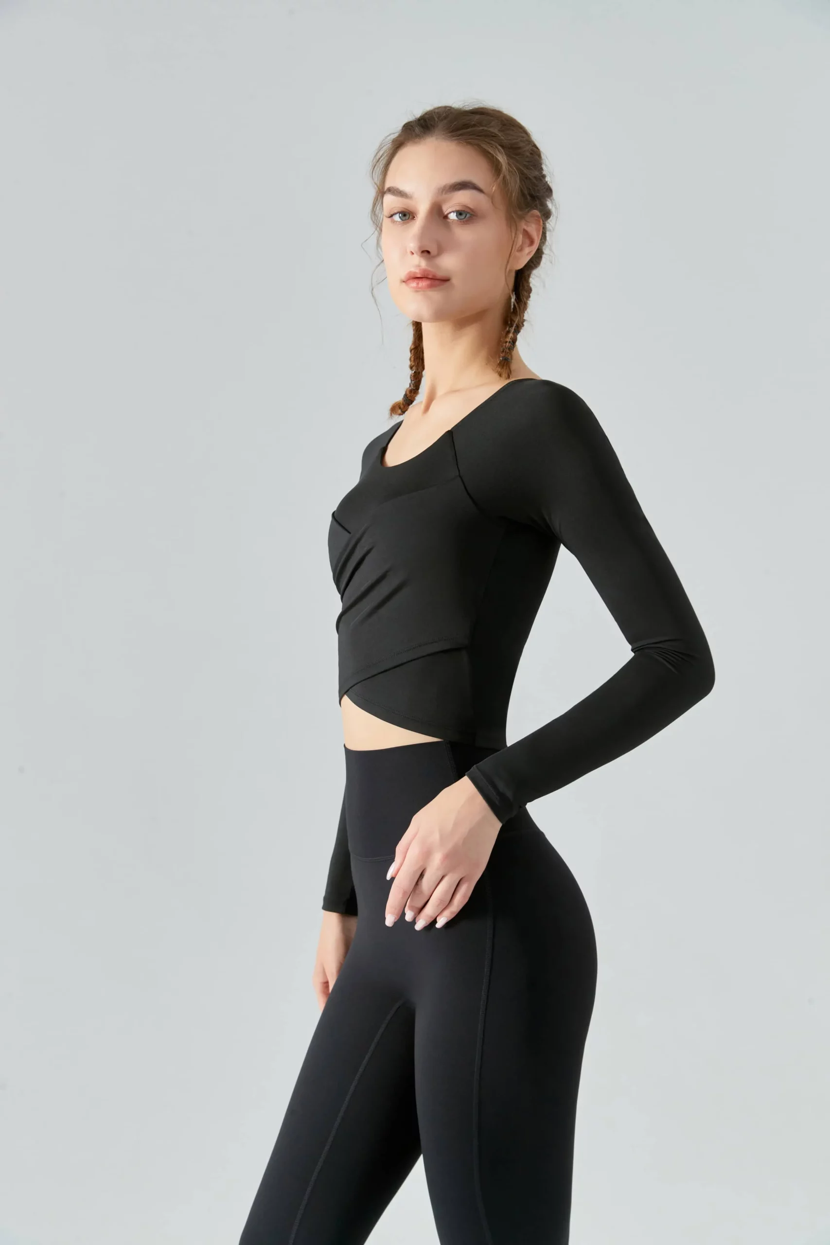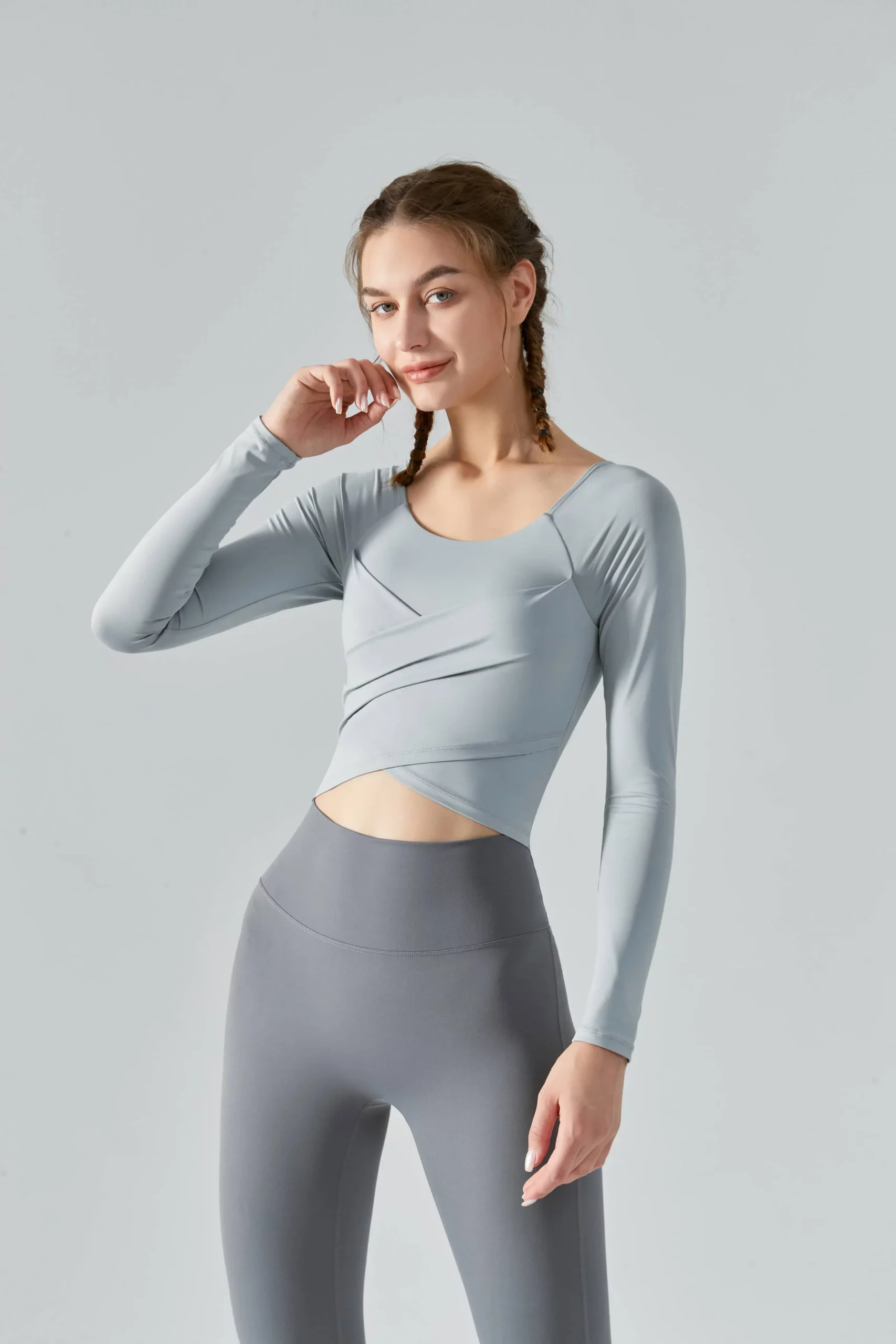 Embrace the cooler seasons with our Women’s Slim Fit Long-Sleeved Yoga Top, designed for both style and function during autumn and winter workouts. This fashionable fitness top features cross pleats and a slimming silhouette, making it perfect for yoga, sports, and other fitness activities in colder weather.
